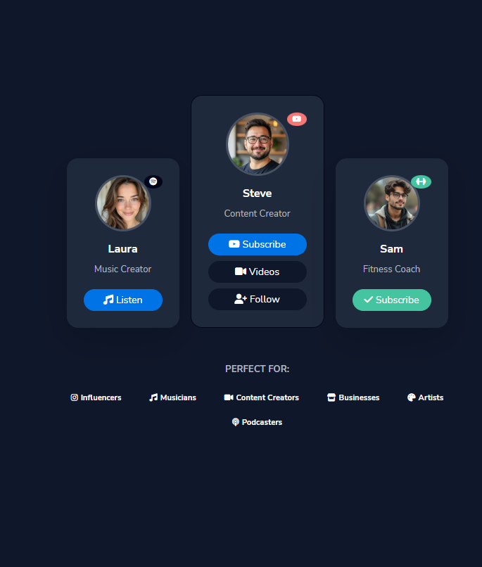 Create a stunning, mobile-optimized bio page that consolidates all your important links, social profiles, videos, products, and donation options into a single, shareable URL. Perfect for Instagram, TikTok, Twitter, YouTube, and all social platforms where you can only share one link.